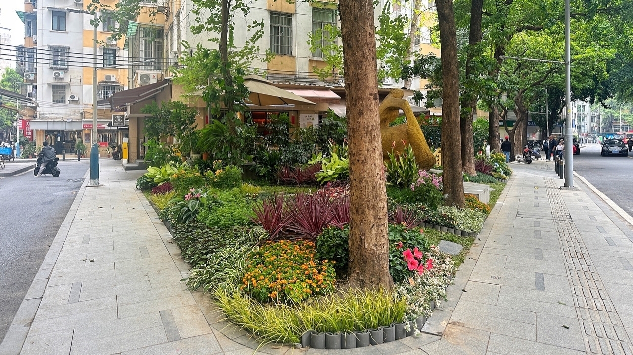 人民街太平通津社区紧扣“百年沙洲”历史与红色文化,精心种植木棉花,强化景观叙事功能,让“英雄花”成为传承红色记忆的“活载体”;农林街以“广东省农事试验场”历史为脉络,选用特色农林植物,在绿意中诉说现代农林业的起步历史。在功能设计上,项目还注重实用功能与生态效益的统一,引入药食同源植物和驱蚊植物,提升绿化设施实用功能,让绿化不仅“好看”更“好用”,实现生态效益、文化效益与社会效益的有机统一。