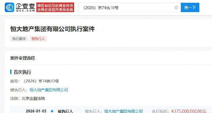 此外,北京金融法院另对恒大地产集团有限公司强制执行,执行标的约41.75亿元人民币。